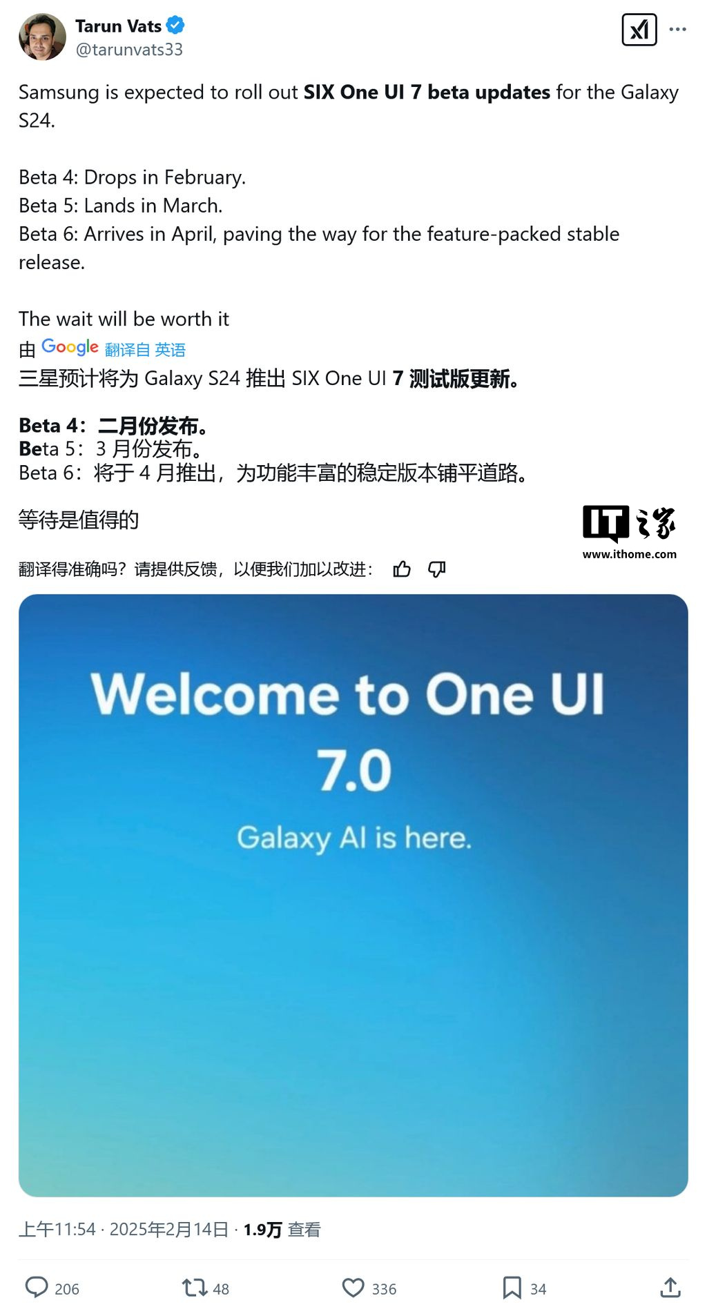 IT之家 2 月 14 日消息,对于仍在期待 One UI 7 的 Galaxy S24 系列用户来说,这里有个坏消息,消息源 @tarunvats33 称三星还在打磨 One UI 7,总 Beta 数量达到 6 个,预估推迟到 2025 年 4 月推送。