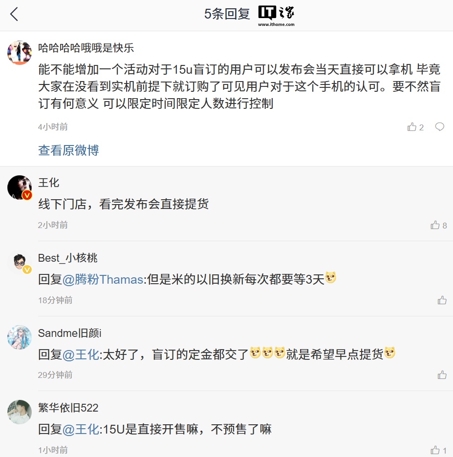 IT之家注意到,小米集团公关部总经理王化今日回应了用户对 15 Ultra 手机发售情况的相关问题,称新机“线下门店,看完发布会直接提货”。