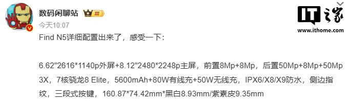 IT之家 2 月 14 日消息,OPPO Find N5 折叠屏手机将于 2 月 20 日发布,这款新机现已现身电信设备终端网并公布部分配置,博主 @数码闲聊站 也进行进一步的补充。