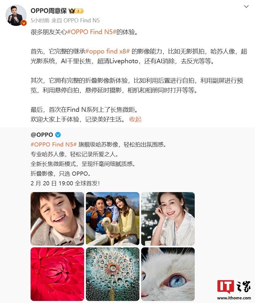 IT之家注意到,OPPO Find 系列产品负责人周意保今日发文透露 Find N5 折叠屏手机完整继承了 Find X8 影像能力,支持无影抓拍、哈苏人像、超光影系统、AI 千里长焦、超清 LivePhoto、还有 AI 消除 / 去反光等功能。