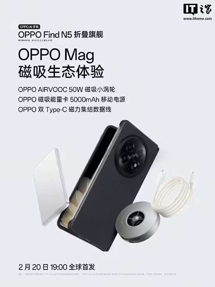 此外,OPPO Find N5 折叠屏手机还将支持 OPPO AIRVOOC 50W 磁吸小涡轮、OPPO 磁吸能量卡 5000mAh 移动电源,这两款产品此前已经上市,售价分别为 299 元和 149 元。