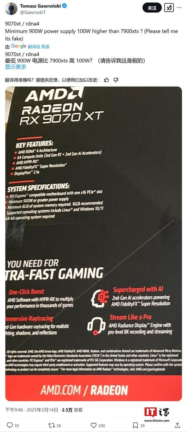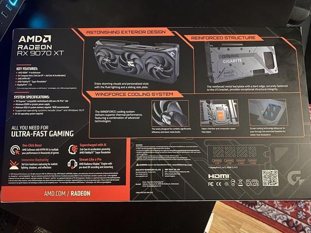 IT之家查询该消息源账号,发现他还分享了技嘉 RX 9070 XT Gaming OC 显卡外包装,显示需要 850W 电源,并分享了开箱体验。