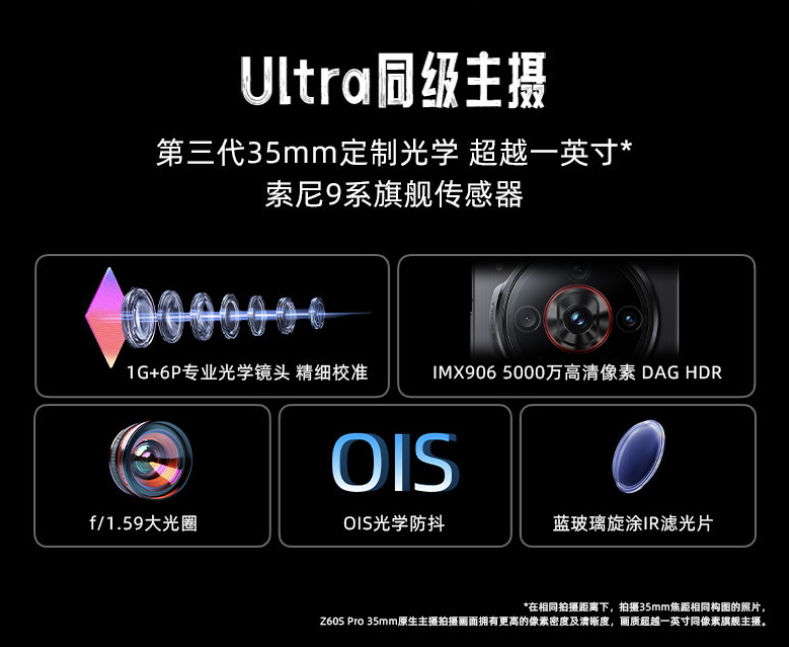 努比亚 Z60S Pro 搭载 Neovision 泰山 Al 影像 2.0 系统,配备第三代 35mm 定制光学,后置 50MP 主摄(索尼 IMX906,OIS,1/1.56 英寸,1G+6P,35mm)+50MP 超广角微距(豪威 OV50D40,13mm)+ 8MP 直立长焦(海力士 Hi847,OIS,1/4.4 英寸,80mm),支持 2.5 厘米超级微距,十二大星空算法;前置 16MP(豪威 OV16AQ)自拍镜头。