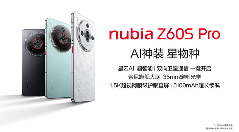 努比亚 Z60S Pro 搭载高通骁龙 8 Gen2 处理器、LPDDR5X 内存、UFS 4.0 闪存,配备 5100mAh 南海电池,支持 80W 快充、充电分离,内置 AI“0 耗电 2.0”功能等效 5355mAh,理论上可以打 8.5 小时卫星电话。