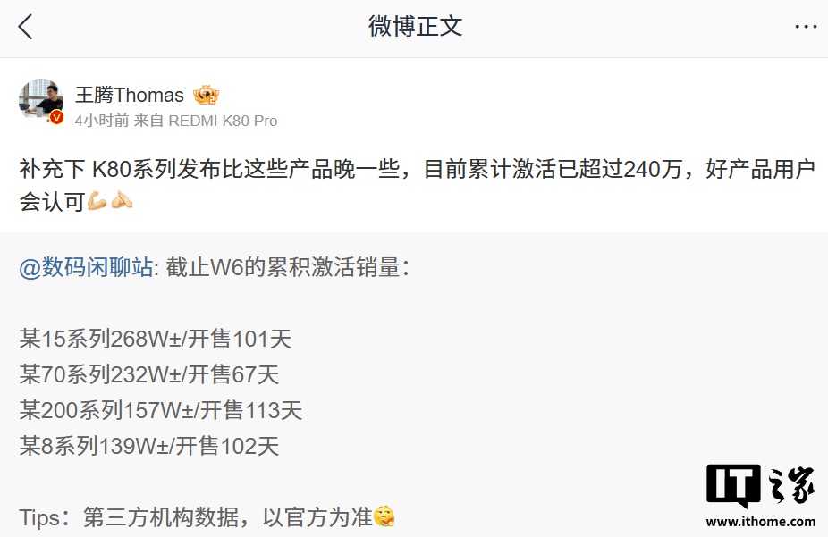 文章来源于互联网:IT之家-小米王腾:REDMI K80 系列手机目前累计激活已超 240 万