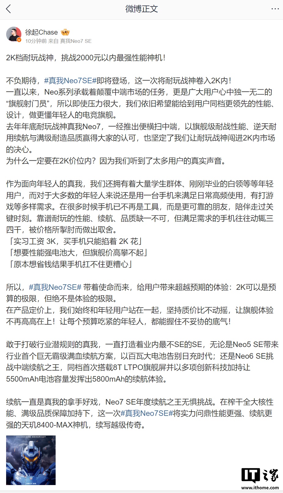文章来源于互联网:IT之家-realme 真我 Neo7 SE 手机官宣:天玑 8400-MAX 处理器、“年度续航之王”,2K 价位内
