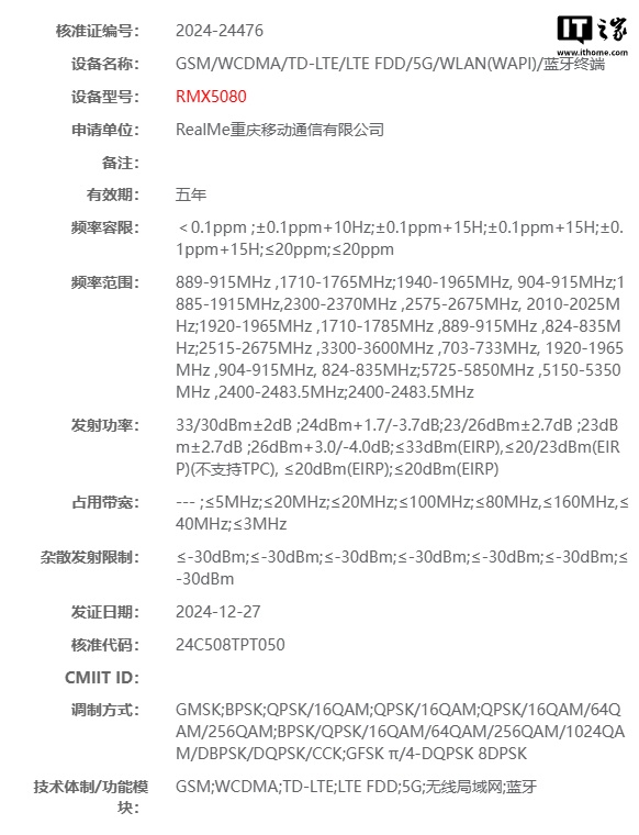 据IT之家此前报道汇总,该机已三证齐全,型号为 RMX5080,支持 80W 快充。