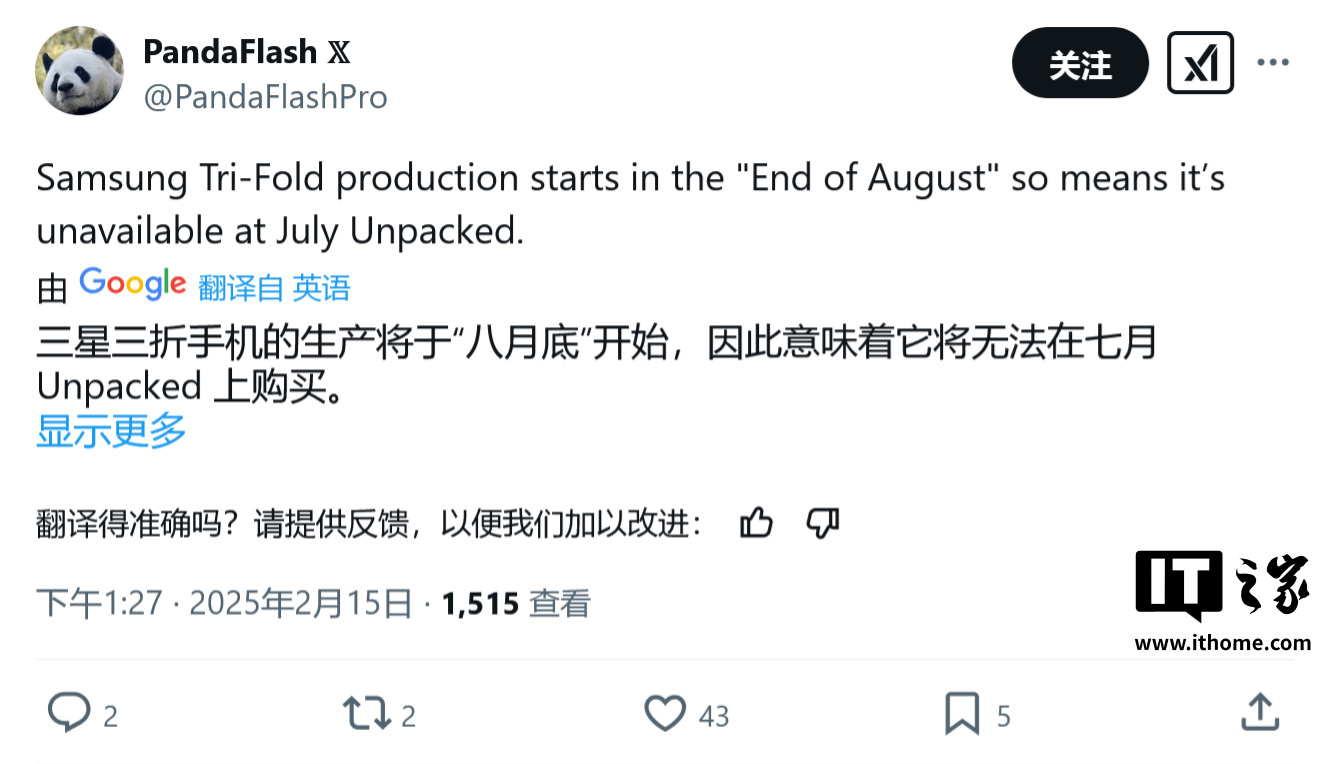 无论面板生产是在 7 月还是 8 月下旬开始,都强烈暗示 G Fold 不会在 Unpacked 发布会上推出。另一位爆料者 Yeux1122 表示,三星可能会将 Galaxy G Fold 保留到明年 1 月发布。由于产量较低,它可能是一款更独特、产量更少的版本。