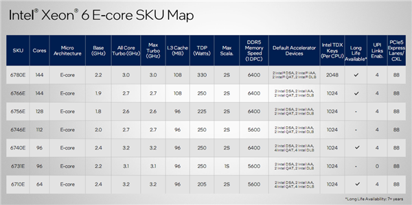 其中,能效核的命名为至强6700系列,性能核的命名为至强6900系列,二者共享通用的硬件平台和软件栈,均支持DDR5内存、PCIe 5.0通道、UPI互联总线、CXL 2.0互联标准。