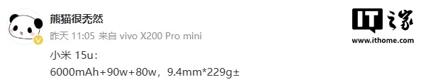 IT之家 2 月 17 日消息,博主 @熊猫很禿然 昨日曝光了小米 15 Ultra 手机的部分外围参数,该机配备 6000mAh 电池 + 90W 有线快充 + 80W 无线快充,机身厚度为 9.4mm、重量为 229g±。