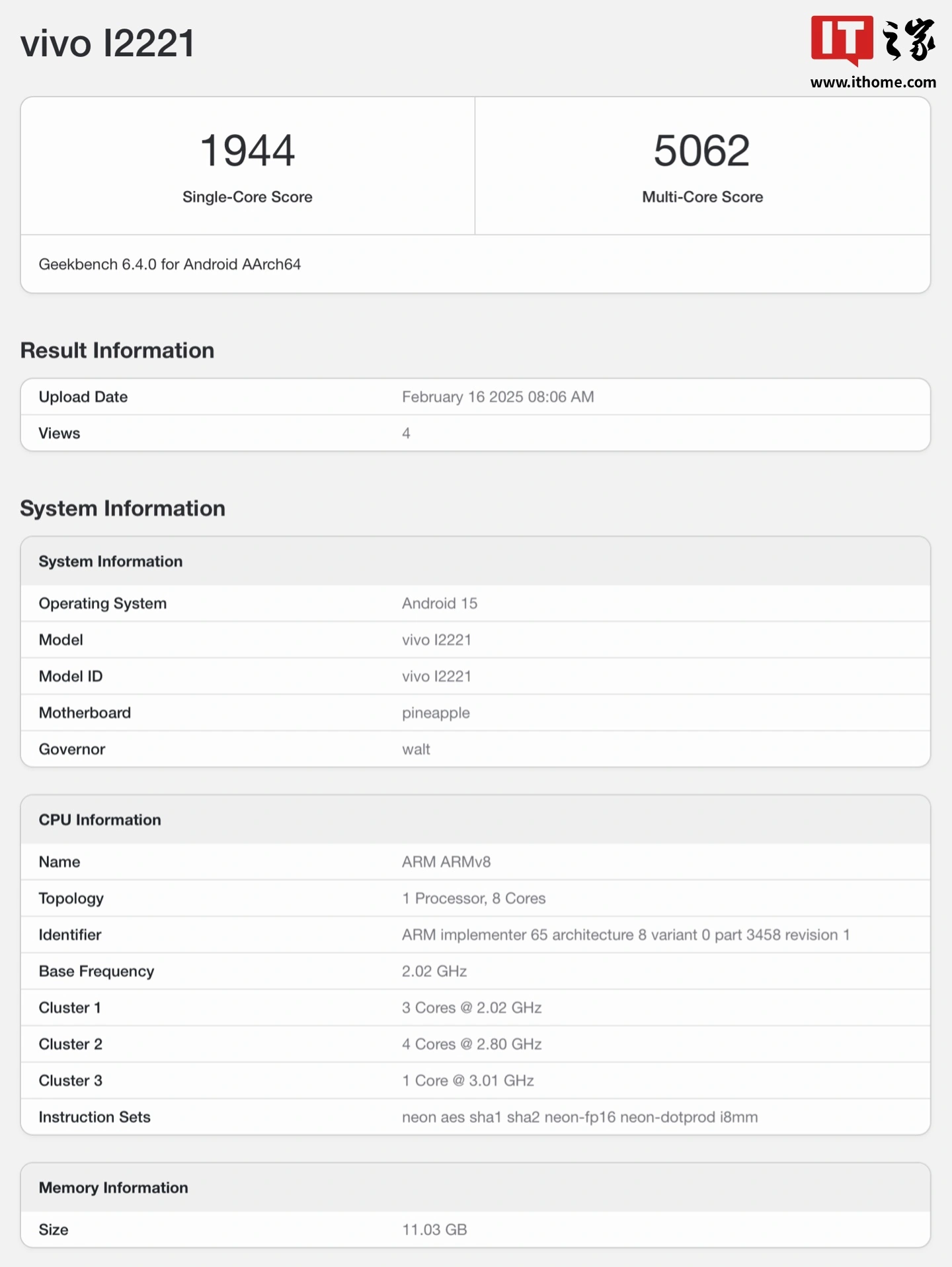 IT之家 2 月 18 日消息,iQOO 将于 3 月 11 日在海外推出 Neo 10R 手机,该机目前已现身 Geekbench 跑分库,显示该机配备高通骁龙 8s Gen 3 处理器,测试机型使用 12GB RAM,跑分报告中机型单核分数 1944、多核分数 5062。