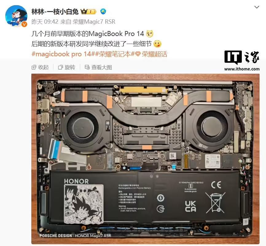 荣耀中国区副总裁、智慧生活业务部部长林林也曾公布早期版本的 MagicBook Pro 14 笔记本内部结构情况,称“后期的新版本研发同学继续改进了一些细节”。