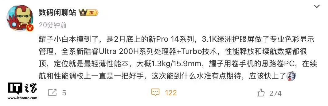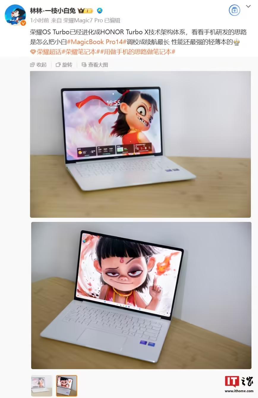 博主 @数码闲聊站爆料称,荣耀 MagicBook Pro 14 笔记本主打纯白配色,号称是“最轻薄性能本”,机身整体重量 1.3 kg、厚度 15.9mm。另外,新笔记本将搭载 3.1K 绿洲护眼屏,提供专业色彩显示管理;全系配备新酷睿 Ultra 200H 系列处理器 + Turbo 技术。