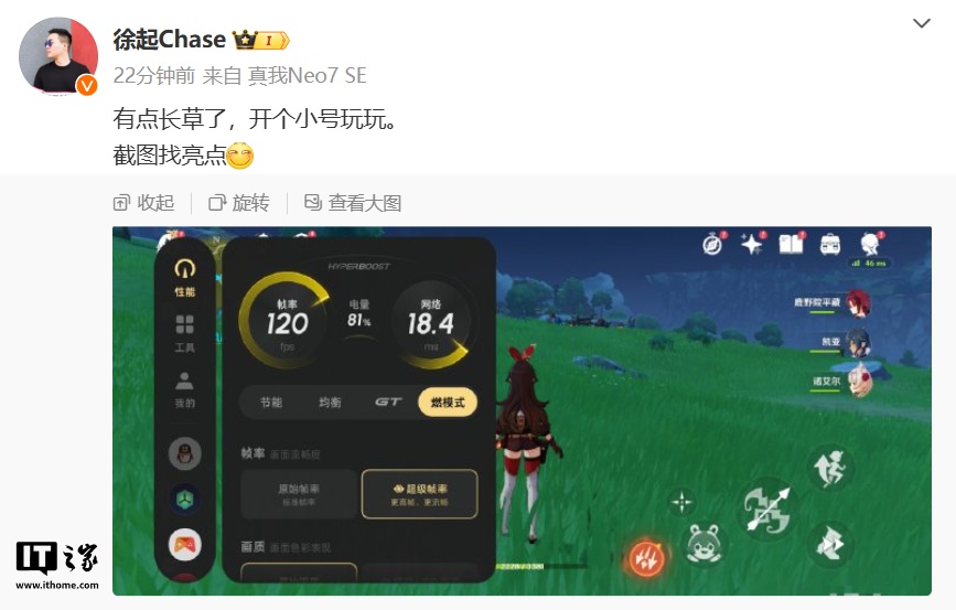 真我 realme 副总裁、全球营销总裁、中国区总裁徐起今日分享了一张《原神》游戏截图(具体机型未明说,但微博小尾巴显示为真我 Neo7 SE),类似游戏助手 App 的工具栏显示该机支持“超级帧率”功能,可提供 120 帧游戏。
