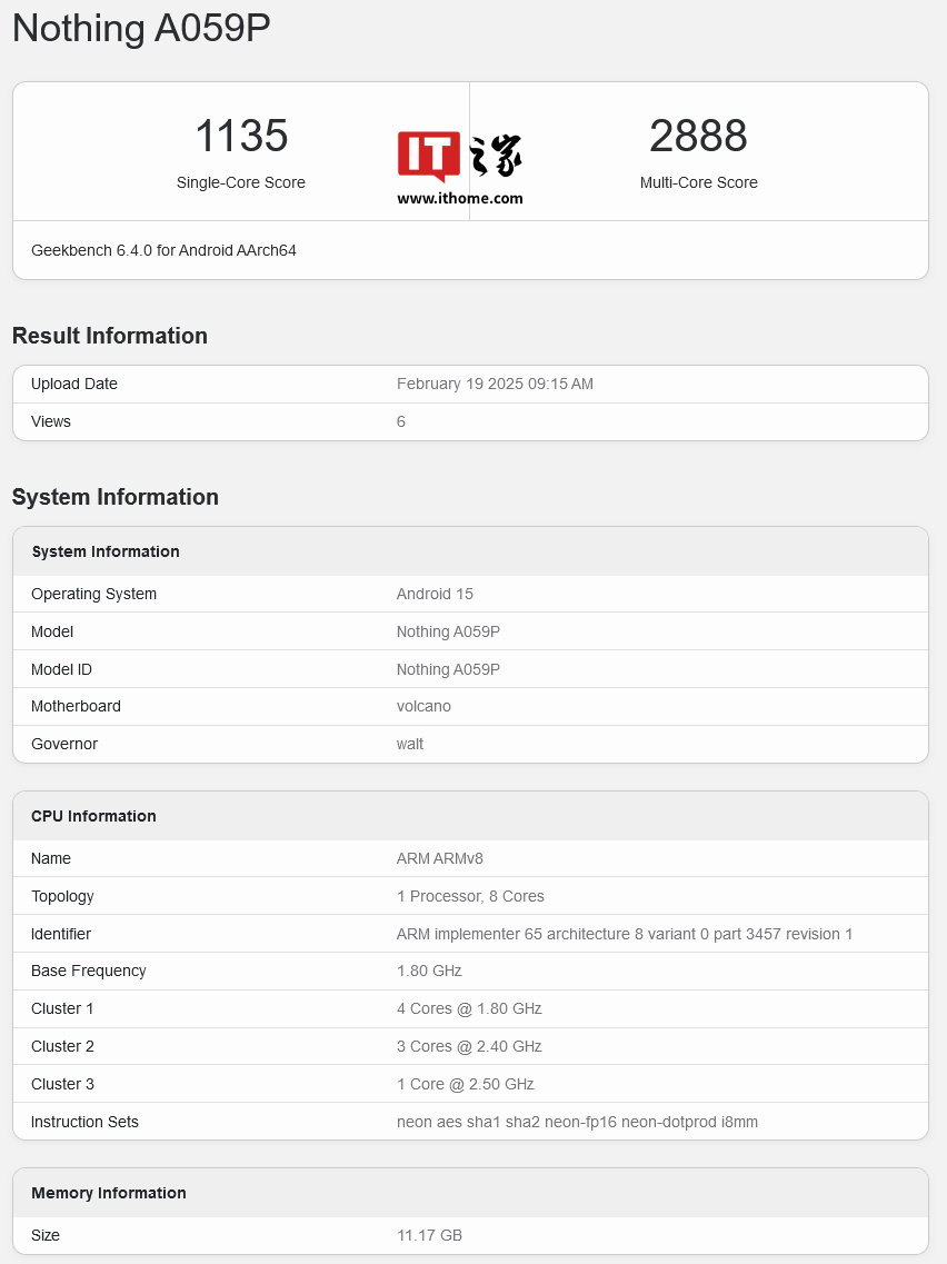 IT之家 2 月 20 日消息,科技媒体 svztechinfo 昨日(2 月 19 日)发布博文,报道称 Nothing Phone(3a)Pro 手机现身 GeekBench 跑分库,6.4.0 版本单核成绩为 1135 分,多核成绩为 2888 分。