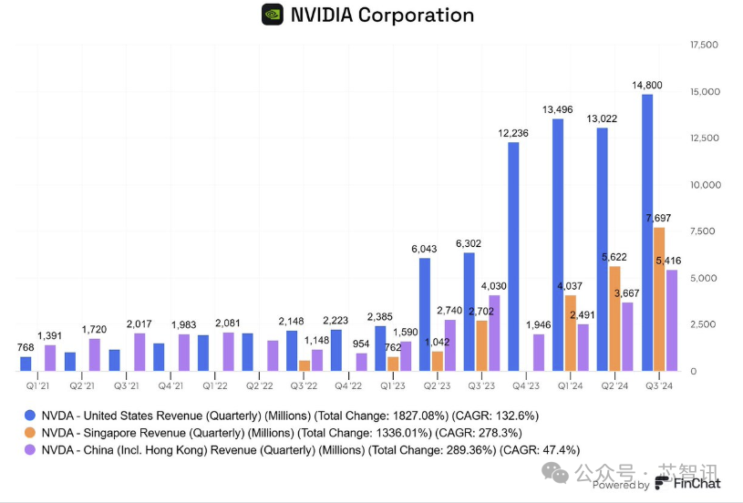 UncoverAlpha的投资者兼分析师Rihard Jarc也表示,英伟达此前公布的截至2024年10月27日的2025财年第三财季(对应自然年2024年第三季度)财报显示,该财季来自新加坡的收入为77亿美元,同比暴涨185%,达到了英伟达在美国市场收入的一半以上。
