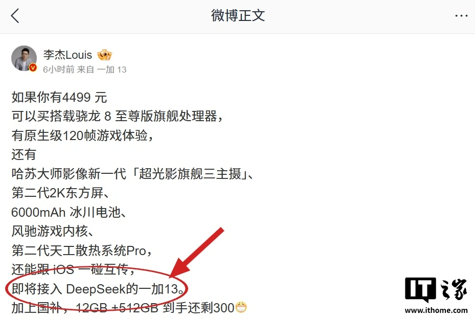 IT之家注意到,李杰今日发文对一加 13 手机进行宣传,并透露该款机型将接入 DeepSeek。