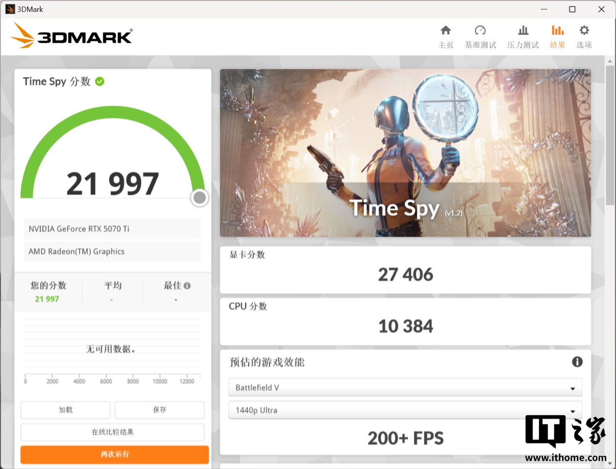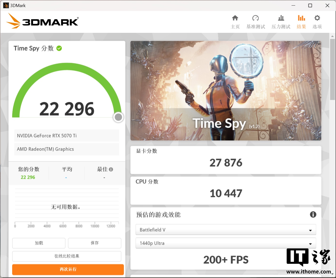 在 3DMark Time Spy DX12 测试中,七彩虹 iGame GeForce RTX 5070 Ti Advanced OC 16GB 显卡分达到了 27876 分,对比 RTX 4070 Ti SUPER(默频)的 23715 分,提升幅度约 17.5%。