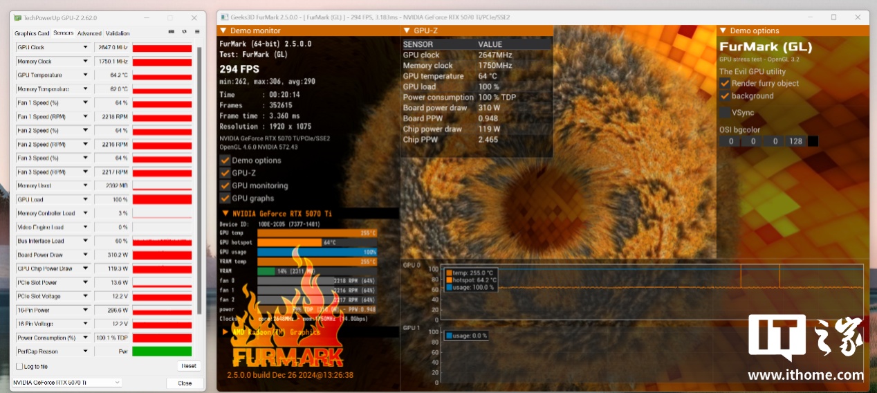 随后我们换成七彩虹 iGame GeForce RTX 5070 Ti Advanced OC 16GB 显卡再次烤机 20 分钟(BIOS 超频模式),GPU 功耗为 310W,高于默频下的 300W,但是 GPU 核心温度却更低,只有 64.2℃,工作频率温度在 2650MHz 左右,看样子在散热上 RTX 5070 Ti 相比 RTX 4070 Ti SUPER 仍有提升空间。