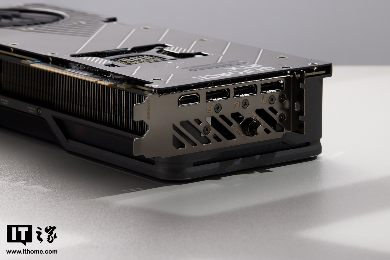 这次的背板设计也颇有新意,纯黑化加固的铝合金背板上做了一些斜切线条装饰和格栅开孔设计,右侧的通风口做成标准圆形,有种宇宙行星运行的既视感,官方还在其中埋入彩蛋,只有在特定角度下才能观测到 iGame 的 Logo(横装显卡俯视),细节处理拉满。