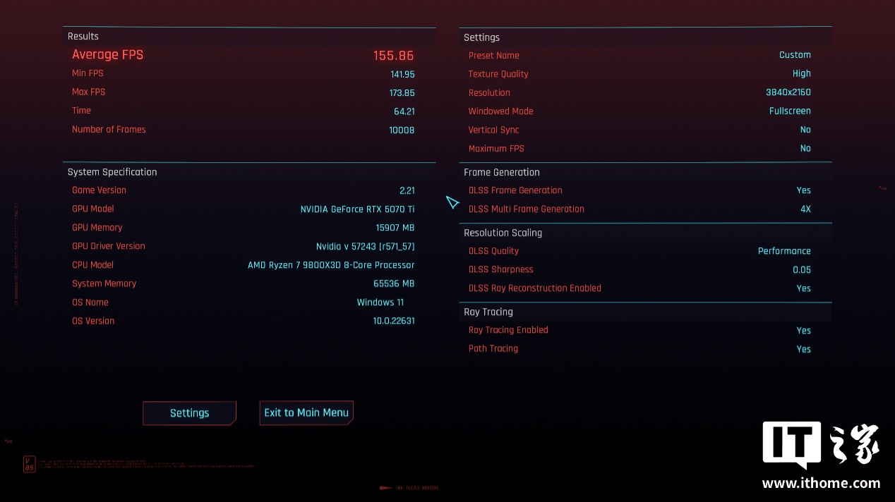 不过,当我们开启 DLSS Multi Frame Generation(DLSS 多帧生成)选项后,游戏帧数的表现瞬间就不一样了。我们依次在 4K 分辨率 + 超速光追画质 + DLSS 性能设置下,选择 2x、3x 和 4x 多帧生成,运行游戏基准测试,分别得到了 88 帧、125 帧和 155 帧的游戏平均帧数,相比不开 DLSS 时的 16 帧,提升幅度分别达到了 5.5 倍,7.8 倍和 9.6 倍,真的相当恐怖,顶着 4K 分辨率 + 最高画质,几乎可以跑满 4K / 160Hz 显示器规格的《赛博朋克:2077》,便是 DLSS 4 技术的实力。