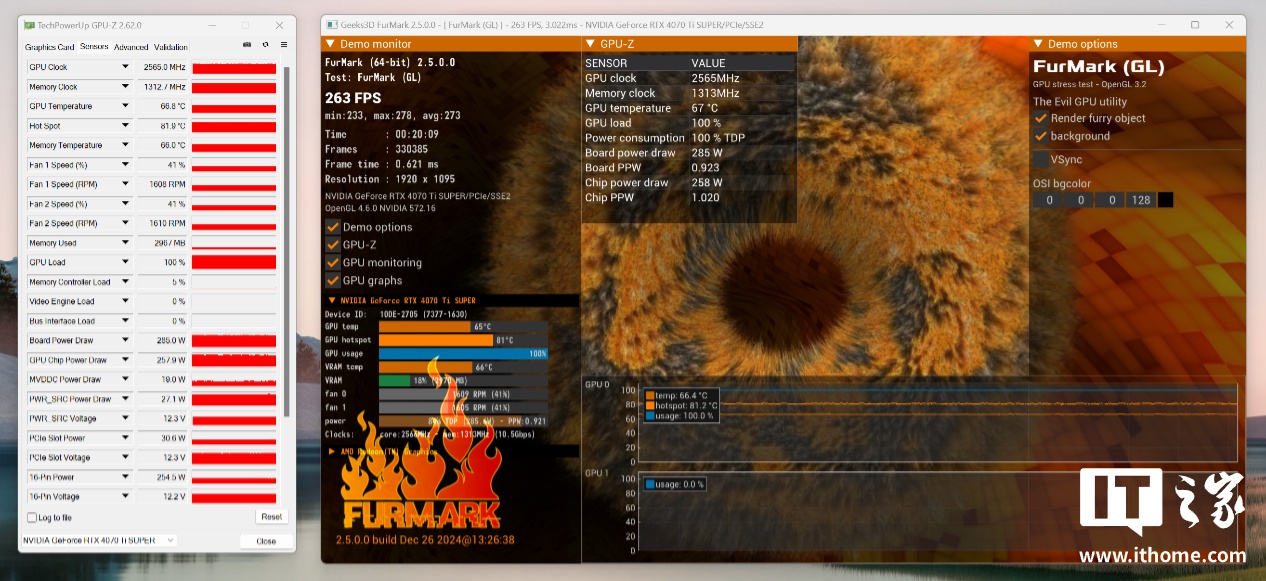 按照惯例先看烤机表现,我们先用这套配置搭配 RTX 4070 Ti SUPER 显卡(BIOS 默频模式)进行 20 分钟的单烤甜甜圈,GPU 的核心温度稳定在 66.8℃左右,GPU 功耗为 285W,工作频率保持在 2560MHz 左右。