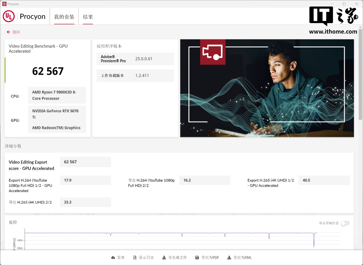 在 UL Procyon 的视频剪辑性能测试项目中,GPU 加速,得益于 Blackwell 架构升级的第九代 NVENC 编码器和 NVDEC 解码器,其在 H.264/ H.265 4:2:2 编码的 8 位和 10 位视频上有着非常大的优势,经过实测: