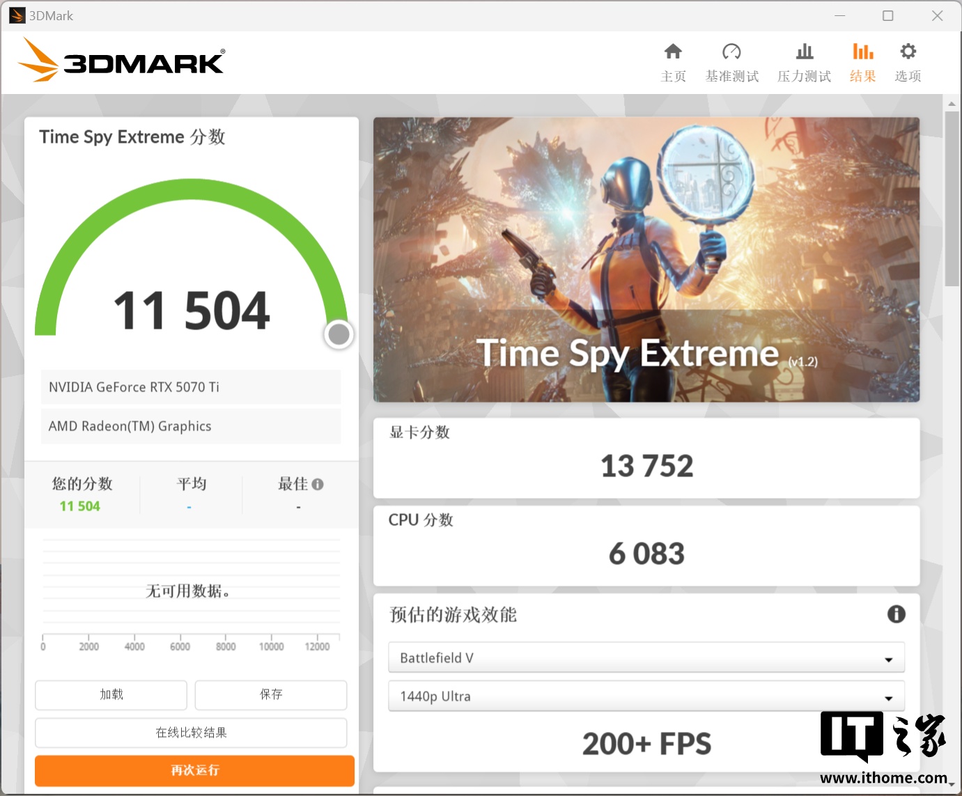 在 3D Mark Time Spy Extreme DX12 测试中,七彩虹 iGame GeForce RTX 5070 Ti Advanced OC 16GB 显卡得分达到了 13752 分,对比 RTX 4070 Ti SUPER(默频)的 11776 分,提升幅度约 16.7%。