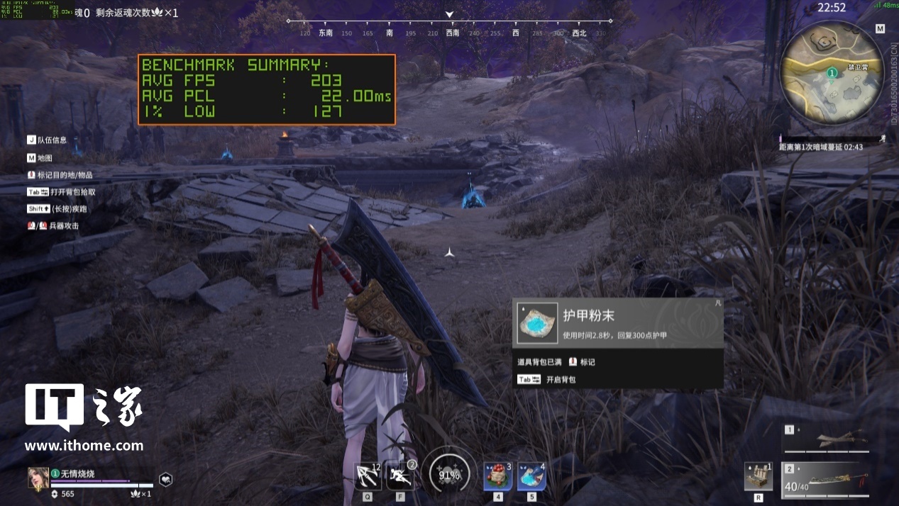 RTX 5070 Ti 在 2K 分辨率 + 最高画质 + DLSS 质量下,游戏平均帧数为 203 帧,1% Low 帧 127 帧,平均延迟 22ms;