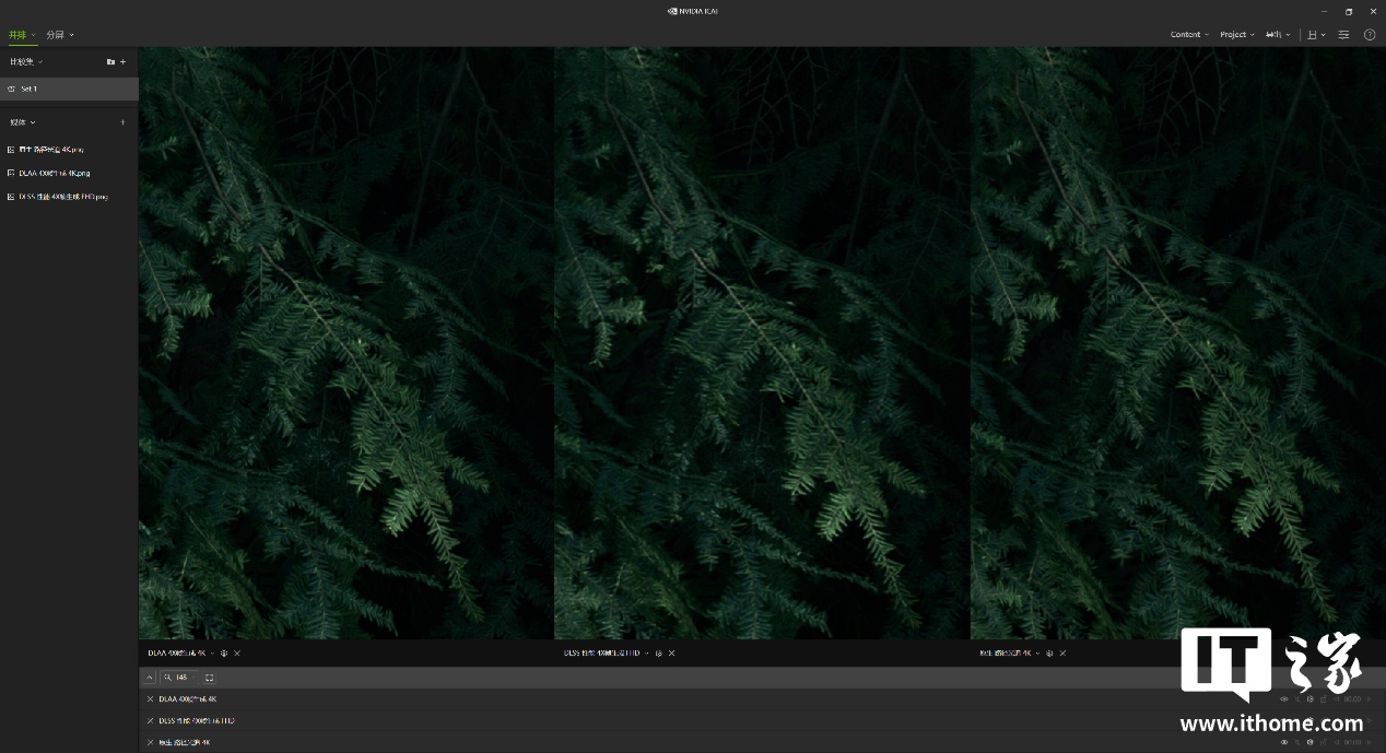 然后通过 NVIDIA ICAT 工具进行比较,在不放大的情况下 3 者根本看不出区别,所以我们挑选了 3 处细节进行放大对比。