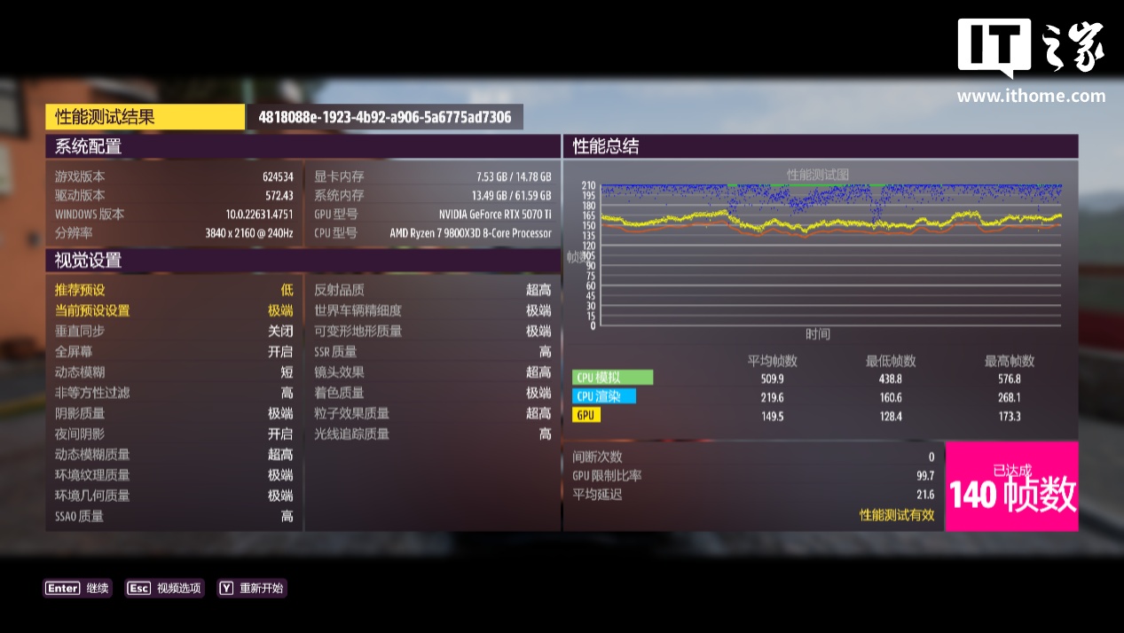 RTX 5070 Ti 在 4K 分辨率 + 极端画质下,游戏平均帧数为 140 帧,1% Low 帧 113 帧;