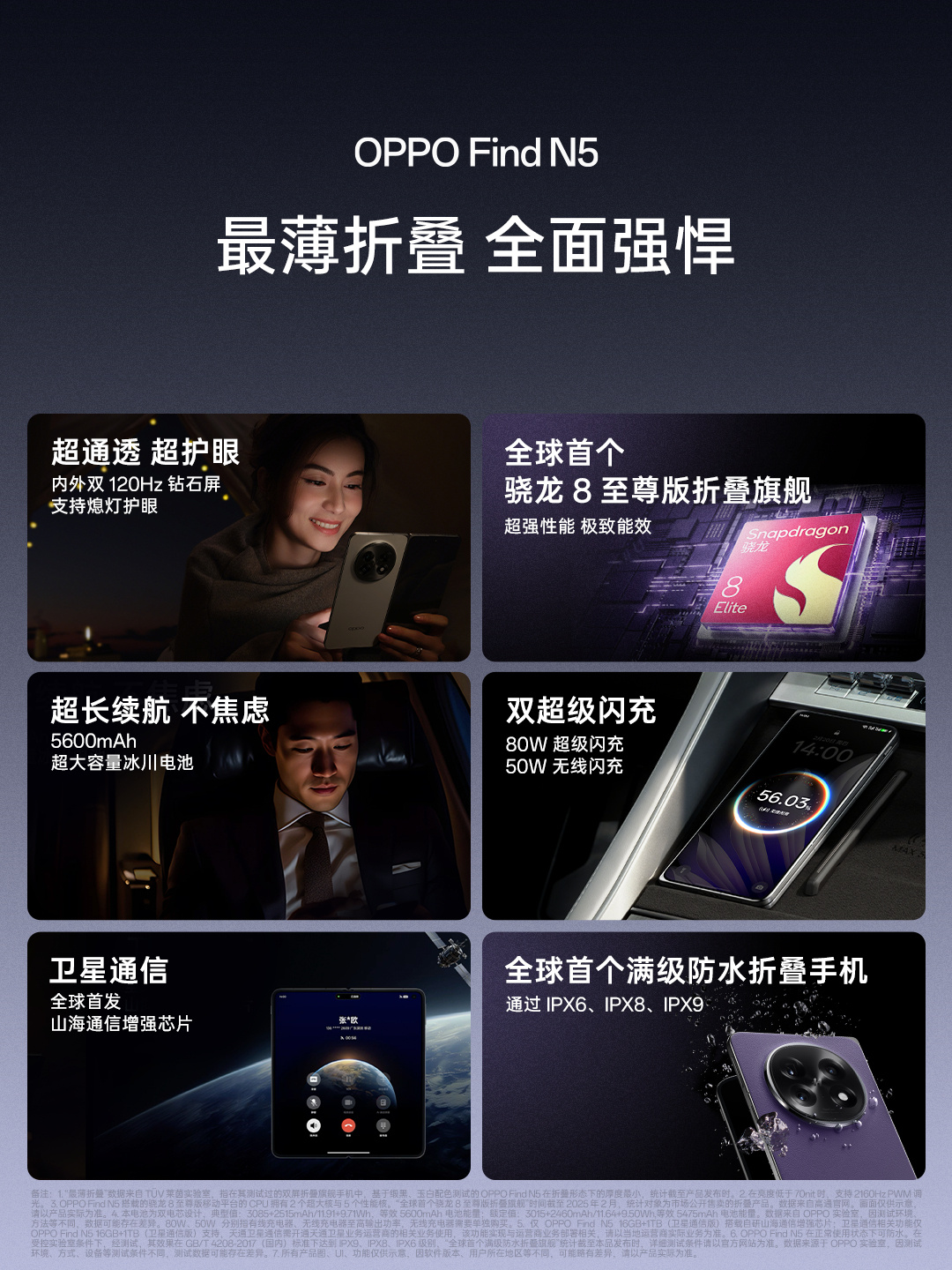 OPPO Find N5 提供缎黑、玉白、暮紫三款配色,闭合状态最薄厚度为 8.93mm,厚度紧贴 Type-C 接口尺寸。OPPO Find N5 展开屏幕尺寸 8.12 英寸,搭载全新骁龙 8 至尊版处理器,机身内置 5600mAh 超大容量冰川电池,支持 80W 超级闪充、 50W 无线闪充。