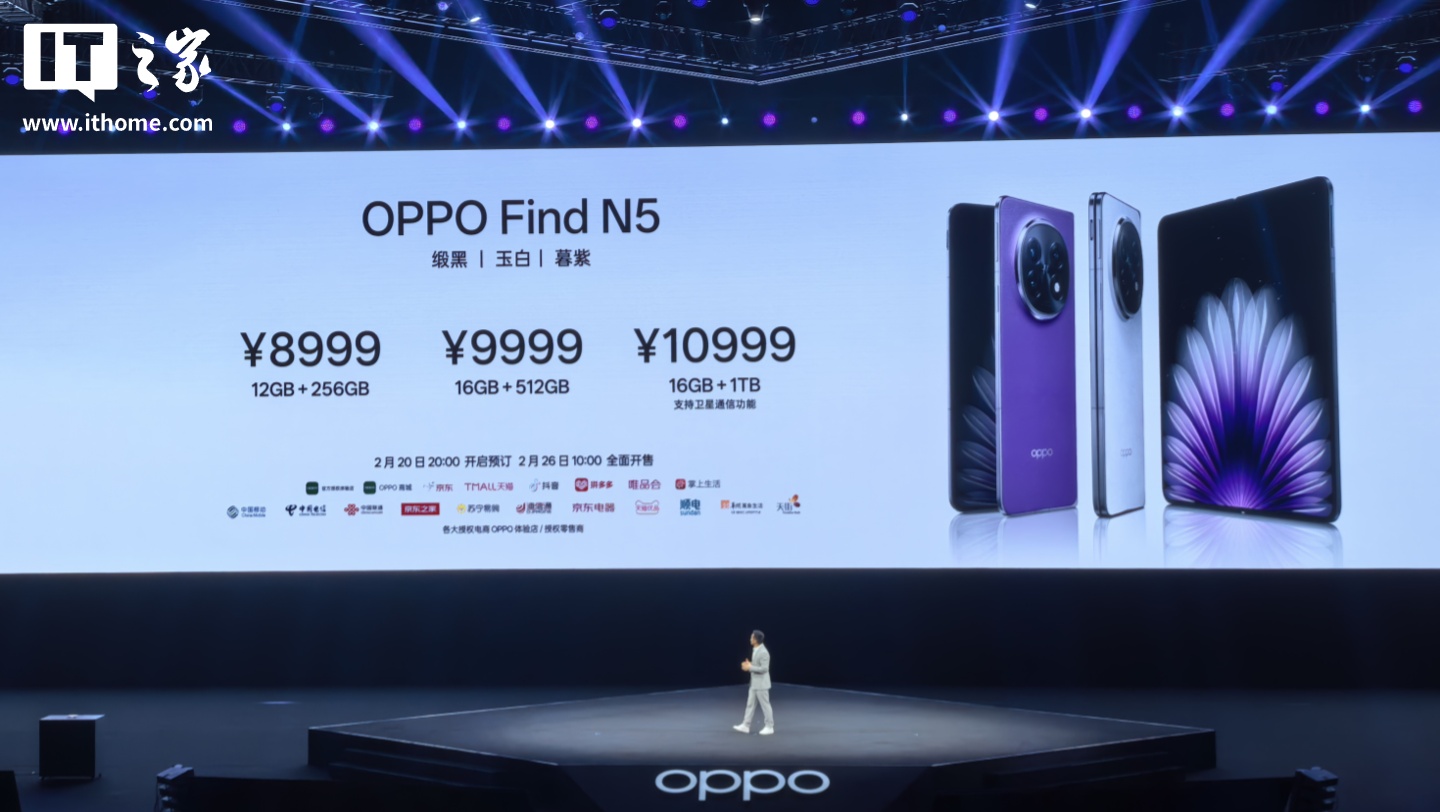 IT之家 2 月 20 日消息,OPPO Find N5 折叠屏手机今晚正式发布,号称“带领折叠旗舰进入 8 毫米时代”“打破全球最薄折叠旗舰纪录”,售价 8999 元起。