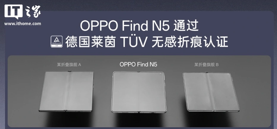 OPPO Find N5 是全球唯一通过德国莱茵 TÜV 无感折痕认证的折叠手机,在持续 336 小时闭合实验中,折痕的最大深度不超过 0.15mm,依然平整。此外,OPPO Find N5 还是全球首个满级防水折叠手机。