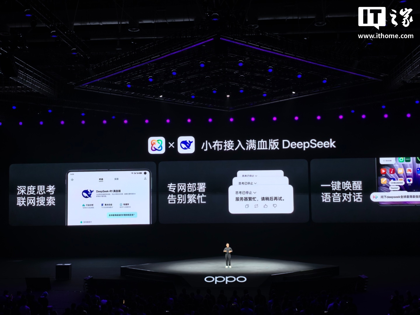 据 OPPO ColorOS 设计总监陈希介绍,小布助手接入满血版 DeepSeek,支持深度思考、联网搜索。另外,OPPO 进行了专网部署,可避免服务器繁忙,同时小布助手支持一键唤醒、语音对话。