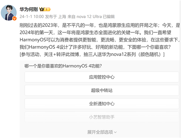 快科技1月1日消息,华为终端BG、首席运营官何刚更新了自己的微博,并透露了公司接下来2024年的一个重要方向。