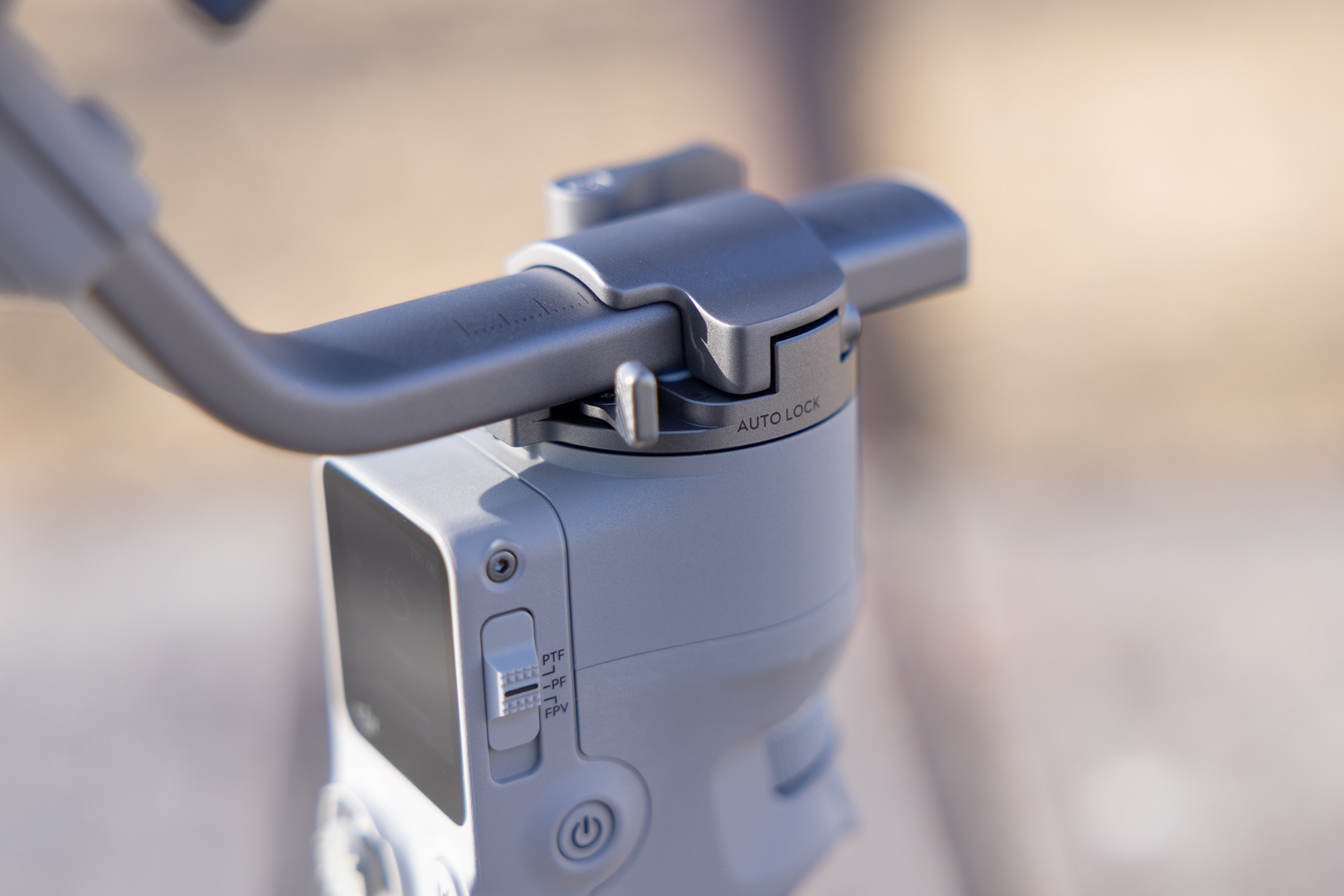 与上一代DJI RS3 Mini手动轴锁不同,这次DJI RS4 Mini采用了第二代自动轴锁设计。开机轴锁自动打开,稳定器展开到工作状态;关机时,轴锁自动锁闭,稳定器自动回到收纳状态。
