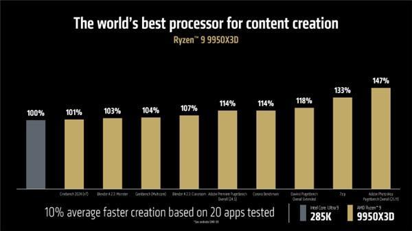 对比Intel酷睿Ultra 9 285K,锐龙9950X3D 40款游戏平均帧率提升30%,最高提升64%。20款生产力软件平均性能提升10%,最高提升47%。做到了对Intel全系桌面CPU的绝对领先,锐龙9 9950X3D发布后,将进一步加强了其高端桌面旗舰CPU的统治力。