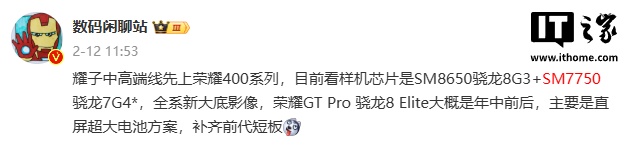 本月早些时候,该博主还透露,荣耀中高端手机将先发布数字 400 系列机型,目前样机芯片为骁龙 8 Gen3 和骁龙 7 Gen4,全系采用新大底影像方案。荣耀 GT Pro 手机将搭载骁龙 8 Elite 处理器,大概年中前后发布,该机采用直屏 + 大电池方案。