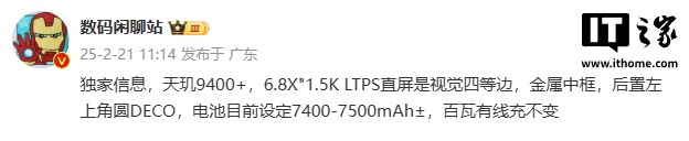 IT之家 2 月 21 日消息,博主 @数码闲聊站 今日曝光一款天玑 9400+ 新机的部分规格,预计为小米 REDMI K80 至尊版(Ultra)。