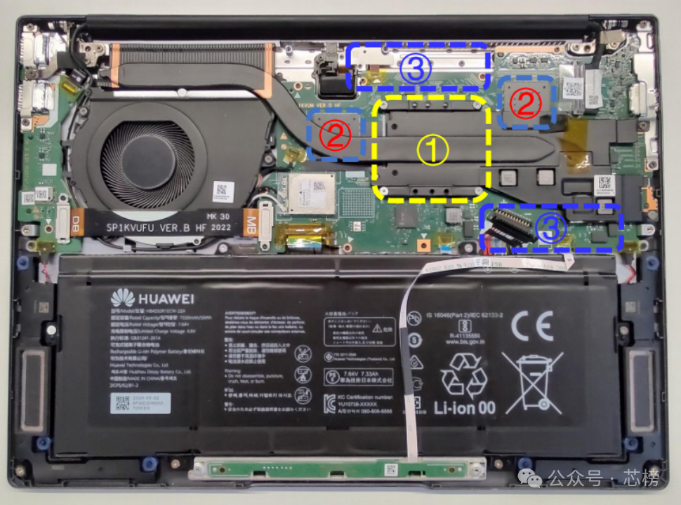 图一是华为擎云L410拆开后盖的实物照片,从实物照片的布局中可以很直观地发现几个特点,在图中标出了①②③,一一展开来看: