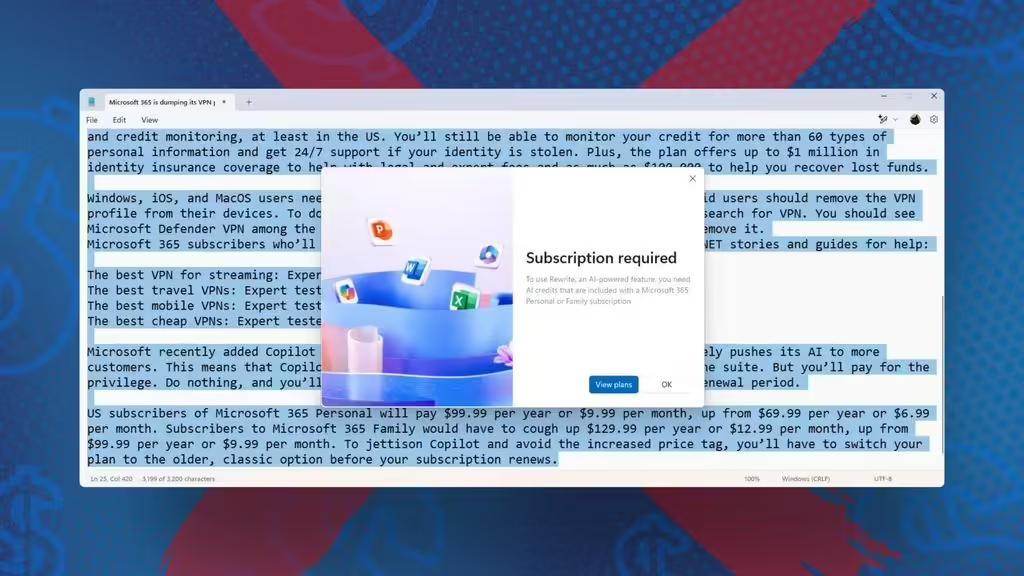 微软此前邀请 Windows Insider 项目成员测试上述功能,用户可以免费使用上述功能。记事本的多语言拼写检查,以及画图的自动移除图片背景功能仍然免费。而用户想要因此订阅 Microsoft 365,费用为每月 9.99 美元(IT之家备注:当前约 72.5 元人民币)或每年 99.99 美元(当前约 725 元人民币)。