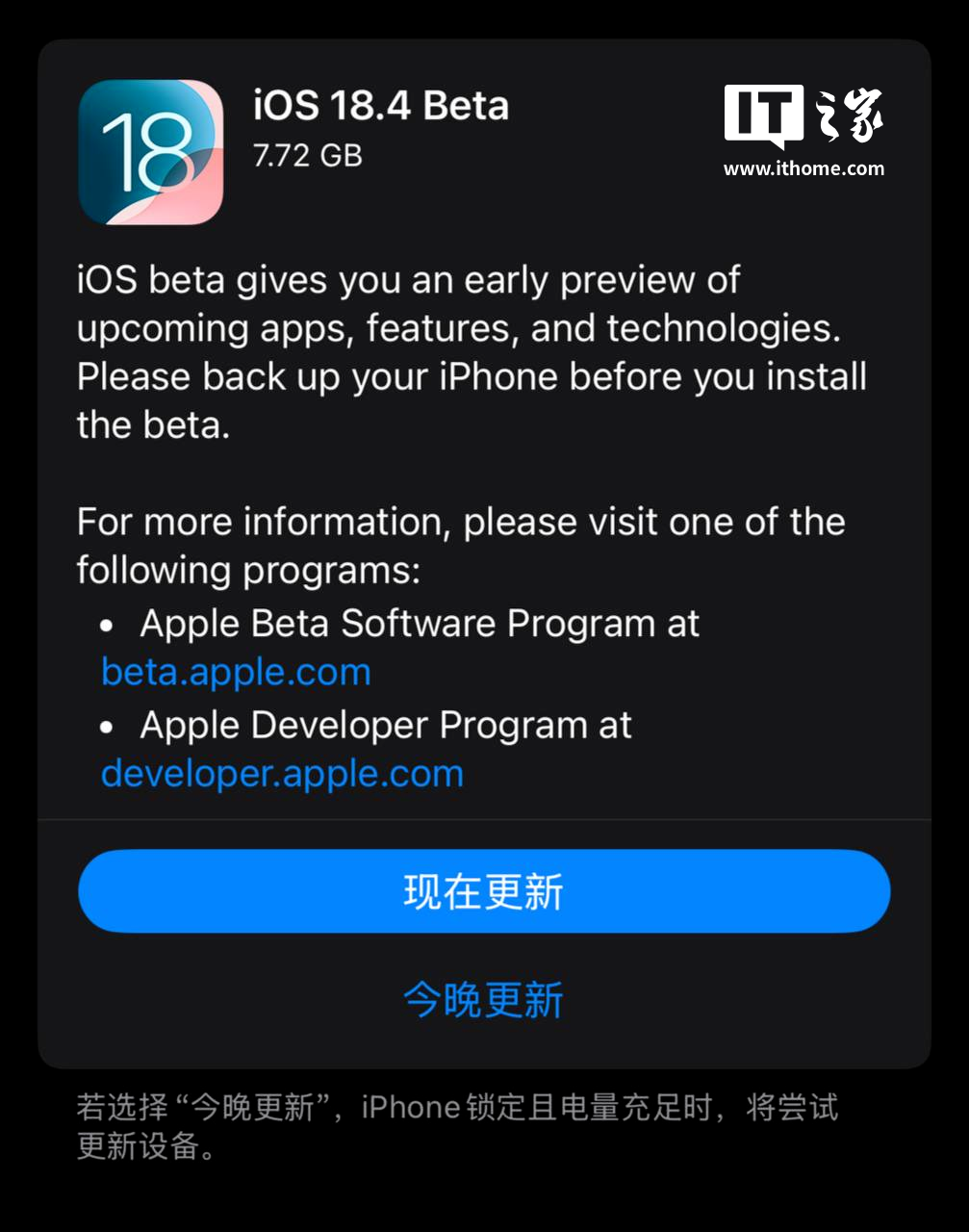 今天(2 月 22 日)凌晨 2 点多,小编在惺忪的睡眼中,看到了 iOS 18.4 Beta 版推送的消息。