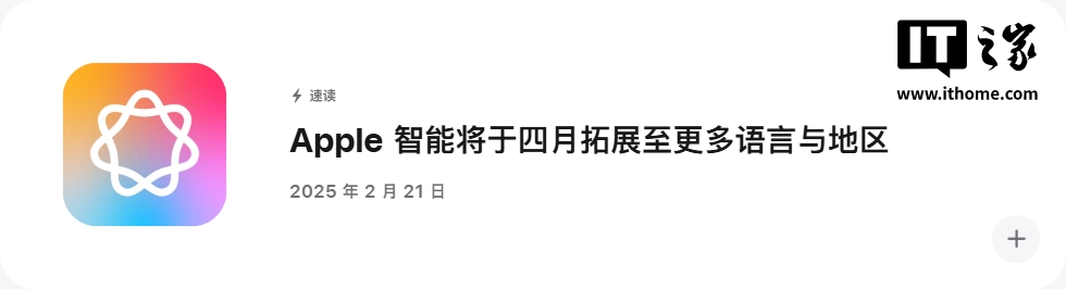 苹果也正式官宣,Apple 智能将于 4 月随 iOS 18.4、iPadOS 18.4 和 macOS Sequoia 15.4 正式版的发布,新增法语、德语、意大利语、葡萄牙语(巴西)、西班牙语、日语、韩语和简体中文,以及新加坡与印度的本地化英语支持。