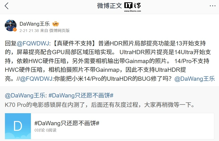 文章来源于互联网:IT之家-无缘 Ultra HDR 提亮功能,小米王乐称 14 / 14 Pro 手机不支持 HWC 硬件压暗