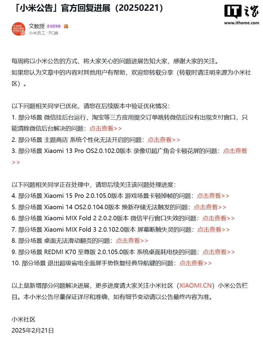 IT之家 2 月 23 日消息,小米官方本周(2 月 21 日)在小米社区发布公告,公布了小米澎湃 OS 问题处理进展,其中提到小米 13 Pro 手机的体验问题优化情况。