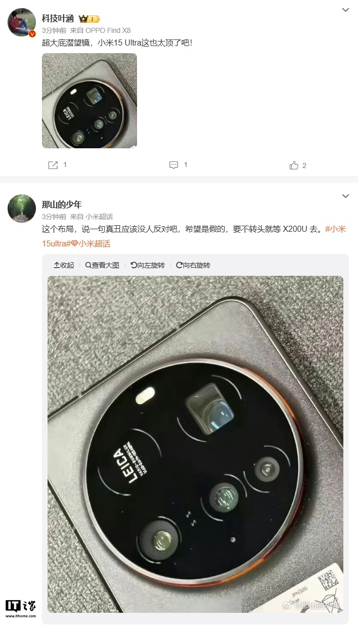 目前,已有多位用户在网络平台分享了一款新机实拍图:照片展示了新机摄像头部分,其采用圆形模组设计、内含四摄、延续徕卡影像,整体外观与此前流出小米 15 Ultra 手机渲染图相近,预计为同款手机。