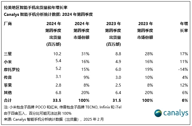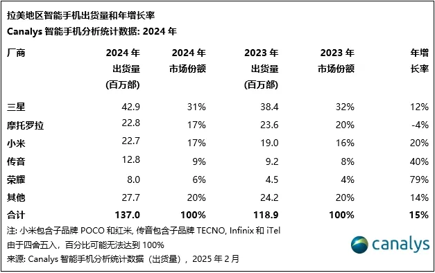 文章来源于互联网:IT之家-Canalys:2024 年拉美手机出货量 1.37 亿部创历史新高,三星、摩托罗拉、小米前三