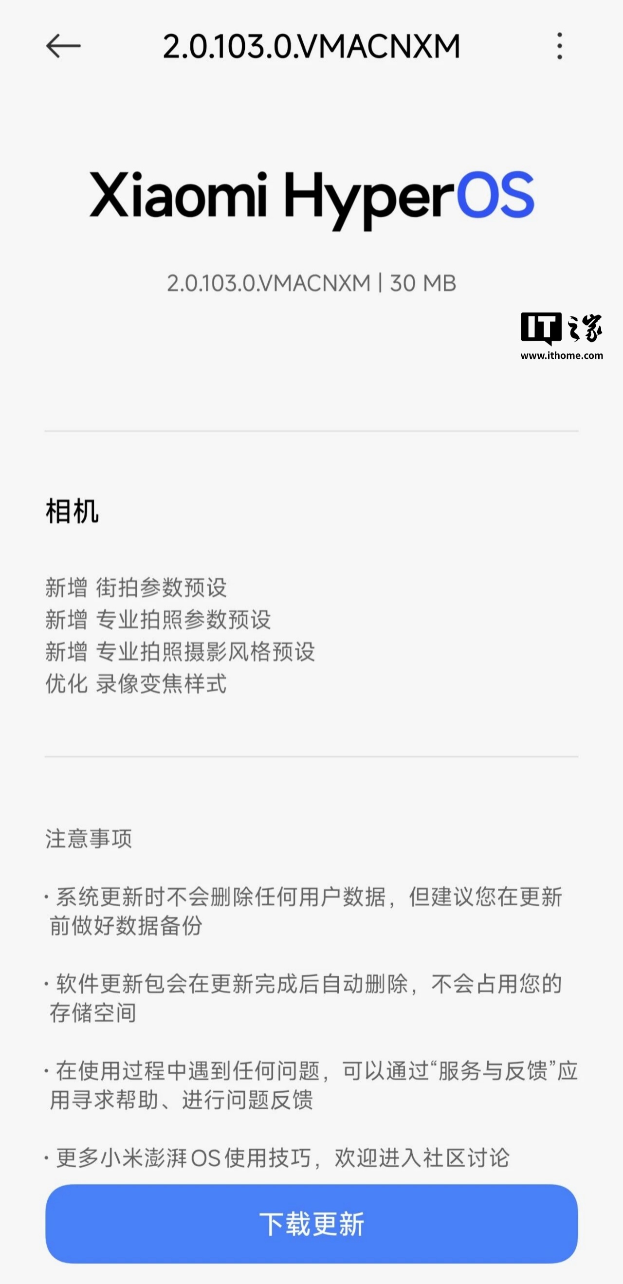 IT之家 2 月 25 日消息,小米 13 Ultra 手机今日推送澎湃 OS 2.0.103.0 正式版内测,新增街拍参数预设、专业拍照参数预设、专业拍照摄影风格预设,优化录像变焦样式。
