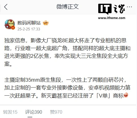 IT之家 2 月 25 日消息,微博博主 @数码闲聊站 刚刚爆料称,vivo 即将发布的骁龙 8 Elite 超大杯(即 vivo X200 Ultra)采用了专业相机的设计思路,包括行业唯一超大底超广角镜头,以及同样的超大底主摄、进光更强的 200MP 长焦镜头,从而“率先实现大三元全焦段全大底方案”。